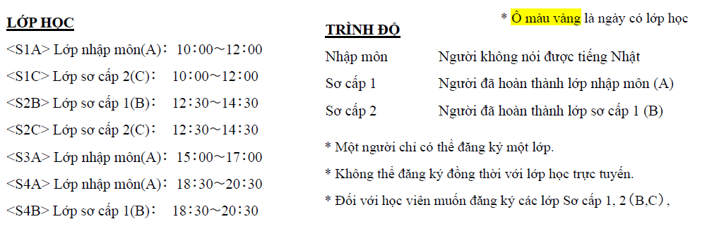 Lịch học Sannomiya Nihongo Plaza Lớp tiếng Nhật sơ cấp tháng 4(Sannomiya) View Lớp tiếng Nhật sơ cấp tháng 4(Sannomiya) as PDF Lịch học Sannomiya Nihongo Plaza Lớp tiếng Nhật sơ cấp tháng 12 Đang Mở
